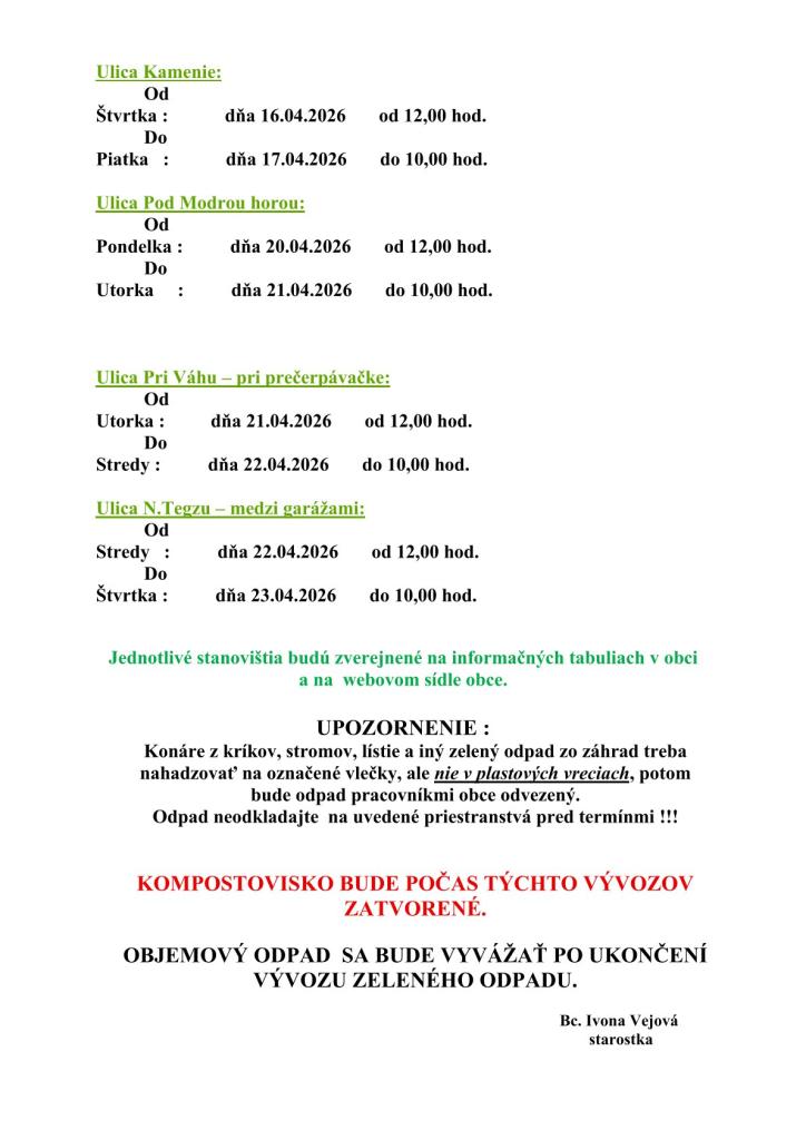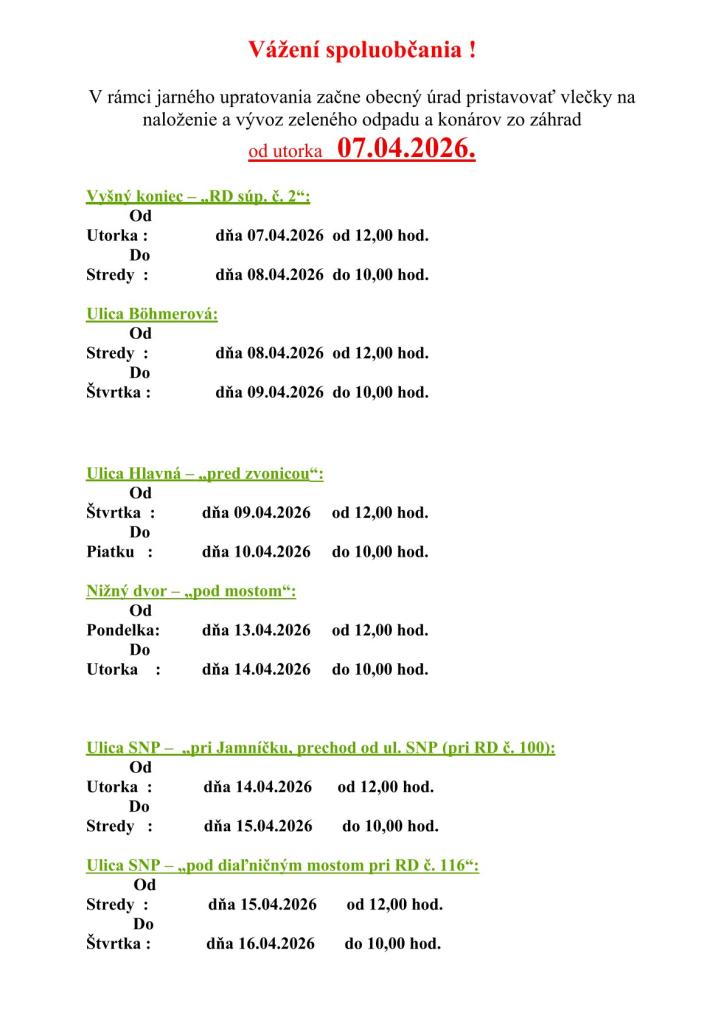 Obecný úrad začne s jarným upratovaním a pristavením vlečiek na zelený odpad a konáre od utorka 07.04.2026. Obyvatelia môžu odovzdávať odpad na určených miestach podľa zverejneného harmonogramu.